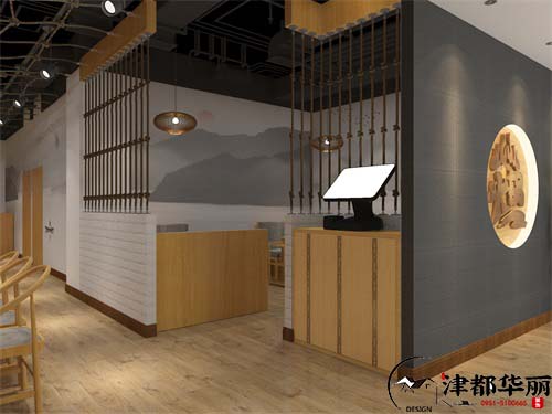 火锅是中国独创的美食,历史悠久。据考证,战国时期即有火锅,火锅不仅是美食,而且蕴含着中华传统饮食文化的内涵。因此火锅店的设计,离不开“中国风”。今天分享的是一家粥底火锅店设计案例,延续门头古朴、庄重、大气的风格,收银台只用醒目的LOGO以及花树略以点缀,显露出刚柔并济之美。打造营造沉静的氛围,在空间产生的对比同时也具有戏剧性。通过设计,本案将江南街巷、院落、桥梁、民居以及江南文化的内涵与精髓逐一展现在食客面前。从文化定位到环境、灯光、音乐、服务都追求一种低调的、内敛的品位,慢的轻的生活方式。水塘才青,本案以三季之景,打造如画般的餐饮空间。包间设计空间上背景简约而雅致,透露出格调之美。整个店面主要利用原木材料设计而成,木材料以其天然的自然脉络,给人清新温暖舒适之感。火锅店室内装修也大多运用自然的原木材料,搭配特别定制的装饰,是一个别开生面极具创意的火锅餐饮空间。