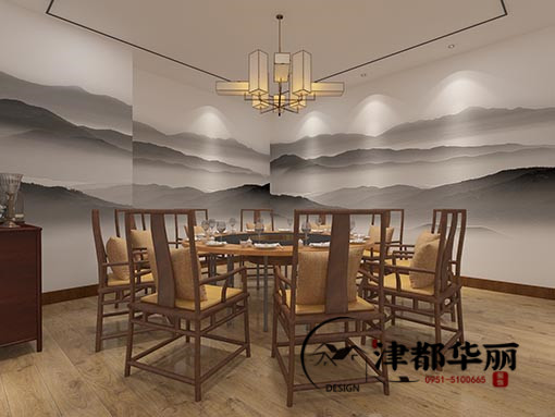 大厅以旧色为基调,铺上木地板,木质的餐桌椅,餐桌上铺上深色的餐布等等,这些装修元素都在营建中式风格的主题。一味地表现古文明,将会略显烦闷,规划师又选用现代的装修资料和谐调配:大幅的水墨画与具现代感的金属资料等等