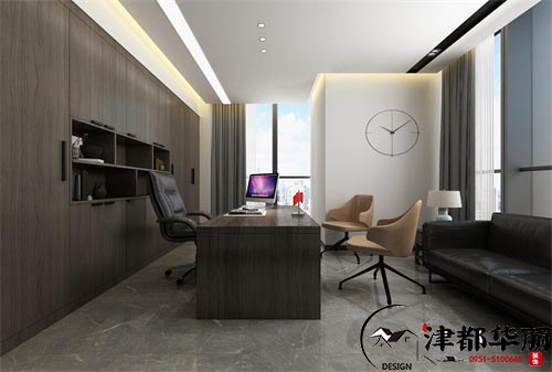 首先闯入眼帘的是企业形象墙,以其企业文化的正义、严谨、高效为主题,形象墙造型设计较为简约,加之以灯光衬托,体现出空间的工整气派以及现代时尚特性,以干练快捷的设计节奏,展示出质量与效率并举的时代精神。大维度的开放式办公布局,开阔了整体办公空间,解放了人的思维。简洁的装饰,对称的空间布局,规范方整、功能健全,与环境形成交流,最终达成默契,突出了现代办公环境讲究效率的特征。会议室的设计要追求质感,色彩的搭配上选择了冷色调,采用了透光不透明,有朦胧感的百叶窗帘进行隔断,空间设计上严谨、大气,而且在一定程度保护隐私。在考虑总经理的办公室空间布局时,因对他为人严谨、负责、勤俭的优良品行有所了解,特摒弃了一切繁文缛节的矫饰,一切尽在实用、明快而流畅的格局中;配合现代办公环境的追求,设置实用与展示性相结合的整墙柜体,旁倚商务型老板桌,既陈设精雅、品味清亮、格调一致,又可于繁忙后赏窗外风光、待客会友。在接待室的处理上,用料实际,无须雕琢张扬,直线条的隔断造型给整个空间增添了一丝隐秘,淡色搭配显得空间大方庄重却内含现代时尚。而且色调淡雅的地毯、沙发、背景,还突出了接待厅亲切、和睦、宽松的氛围,使稳静而坦诚的晤谈气氛盎然一室。