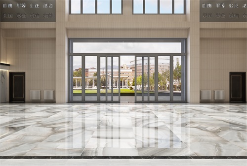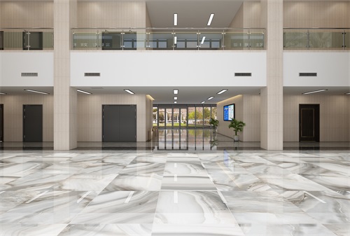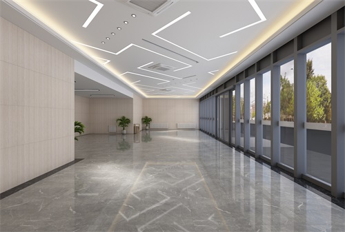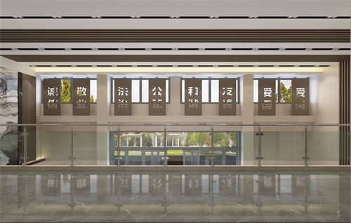 此次办公楼装修面积比较大而且空间规划布局也比较复杂,设计师将办公楼大厅作为设计的重点,一走入大厅就可以看出整个办公楼的设计档次和装修效果。进入大厅,首先我们可以清晰地看到企业的文化标语,以其企业文化的自由、平等、公正、法治、爱国等为主题,体现了企业的发展理念。侧面的大理石装饰墙给整体空间带来了视觉冲击感,也是大厅华丽的标志。大厅地面采用通透而淡雅的花纹瓷砖,直中见曲,打破了单一、整齐的格局,打破原寂静的空间,大厅上方呼应以直线为主调、整齐连贯的吊顶,大直大方显示出强烈的纵深感,加之以排列整齐的灯光设计,让整体空间突显出工整气派、大家风范的企业形象。在二楼走廊的设计上,地面瓷砖的颜色相对沉稳柔和,顶面的造型简约, 以突出空间的舒适感。整体简约大气的装修风格体现出企业办公楼的现代时尚特性,以干练快捷的设计节奏,展示出质量与效率并举的时代精神。