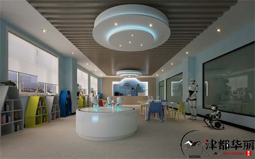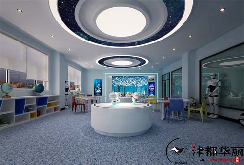随着时代的发展,孩子的多元化教育越来越受到重视,所以教育培训机构也有着更大的发展空间,教育培训机构的整体装修设计是体现空间环境与教育理念是否融合的重要因素,营造一个符合空间主题,并且有浓厚的学习氛围是教育空间的主要意义,今天分享的是编程培训机构的装修设计,400多平米的空间面积,设计师运用简洁、自然的设计理念,希望打造一个温馨舒适的优质空间。空间划分为大厅、前台、休闲区和教室,大厅是机器人展示区,造型简约时尚,顶面的吊顶灯光设计和展示区相互呼应,蓝色的光线散发出科技的时尚感,让空间氛围更加贴合教育主题,吸引孩子的目光,带动他们的思绪,让兴趣迸发,自主学习。阶梯式的休闲区温馨舒适,黑色的背景墙加一组简单的书柜简洁时尚,体现了这块角落的轻松宁静。教室宽敞明亮,用淡雅的色彩装饰下的空间更加整洁有序,为孩子们提供一个安静的学习空间。